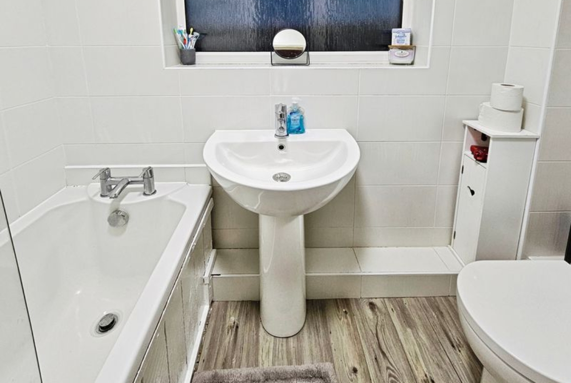 Three piece white suite comprising of; panelled bath with mains shower over, pedestal wash hand basin, low level wc, double glazed window rear, single radiator, tiling to walls, laminate flooring, extractor fan, built in storage.