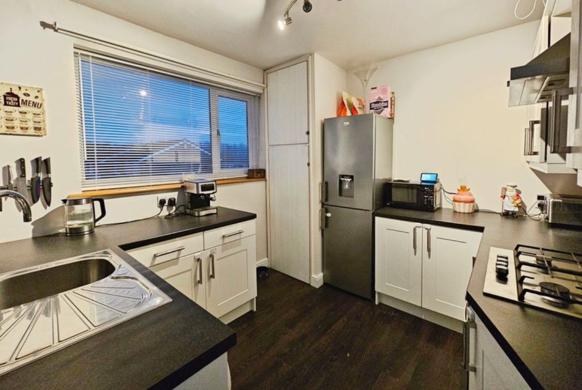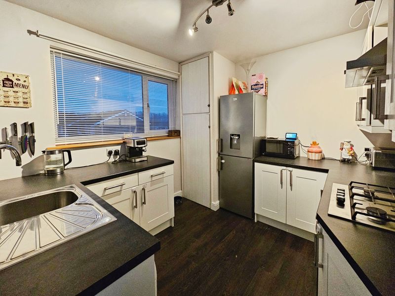 Double glazed window to rear, double radiator, fitted with a range of wall, floor and drawer units with co-ordinating roll edge work surfaces, stainless steel sink unit and drainer with mixer tap, tiled splash backs, built in electric fan assisted oven, gas hob with extractor fan above, space for fridge, plumbed for washing machine, laminate flooring, built in cupboard.