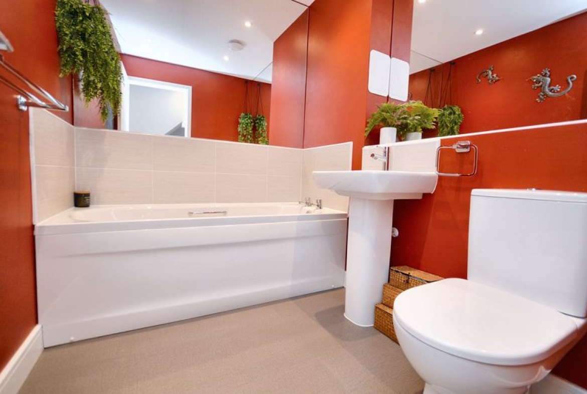 Closed coupled W.C. | Pedestal wash-hand basin | Part mirrored surrounds | Bath with tiled splashbacks | Lino flooring
