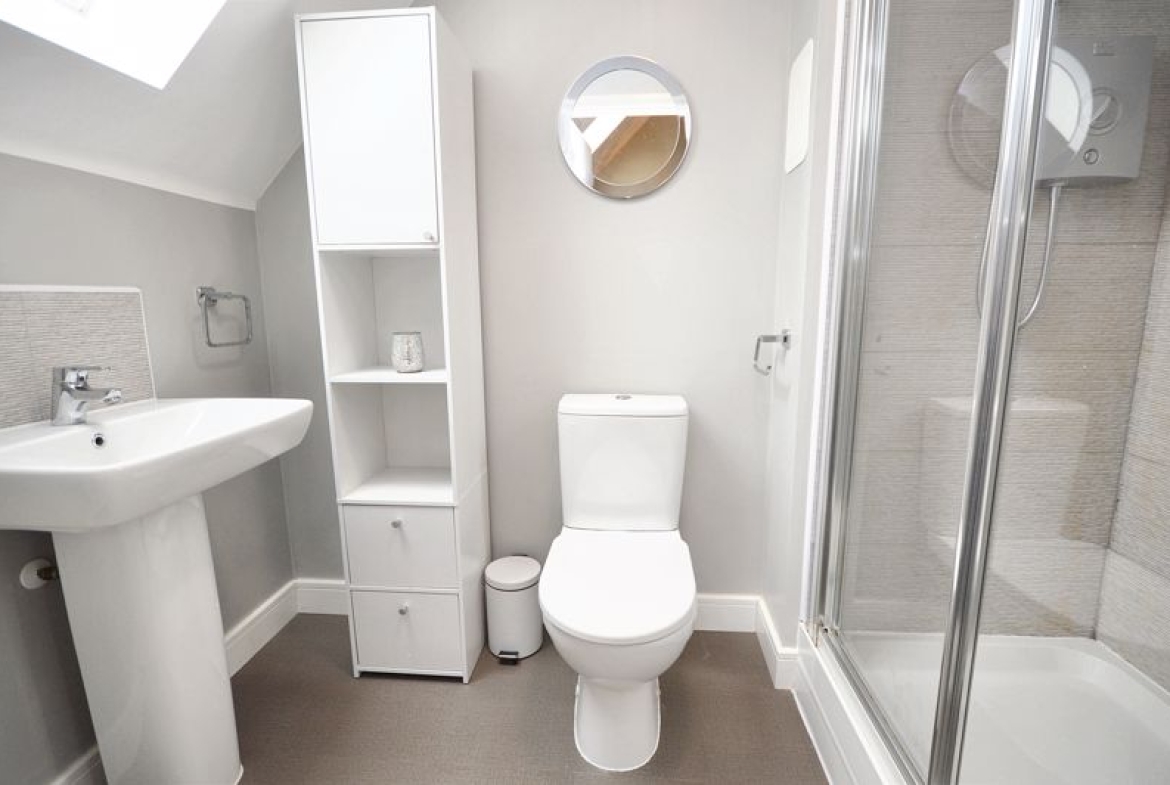 Radiator | Double-glazed Velux style window | Shower cubicle with electric shower and tiled surrounds | Pedestal wash-hand basin with tiled splashbacks