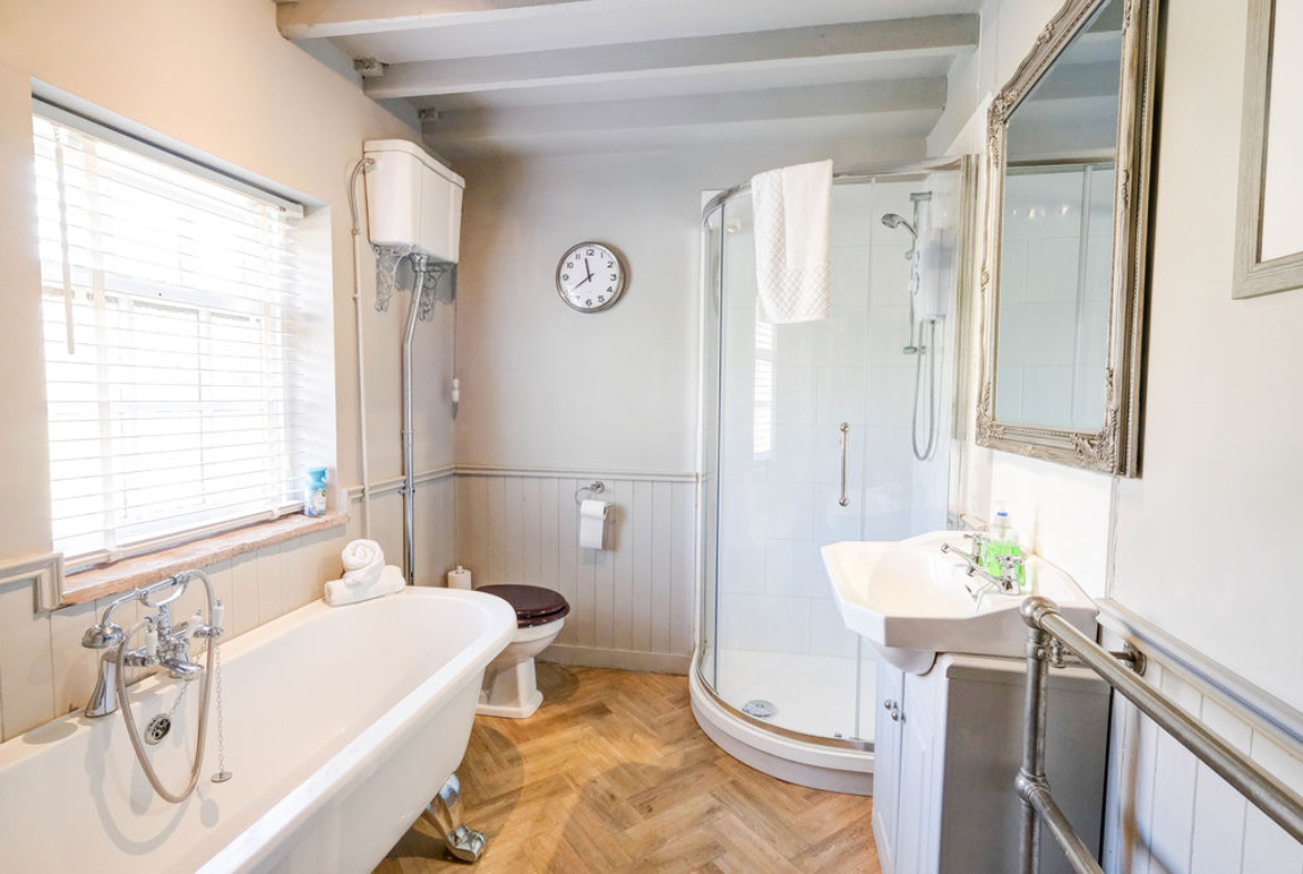 The family bathroom is spacious with a claw footed roll top bath, separate shower cubicle, high level w.c. and vanity wash hand basin. The half-panelled walls and herringbone flooring completes the tastefully presented bathroom with a warm atmosphere.