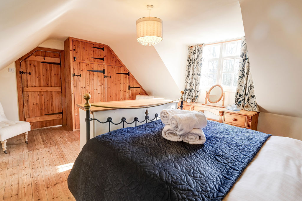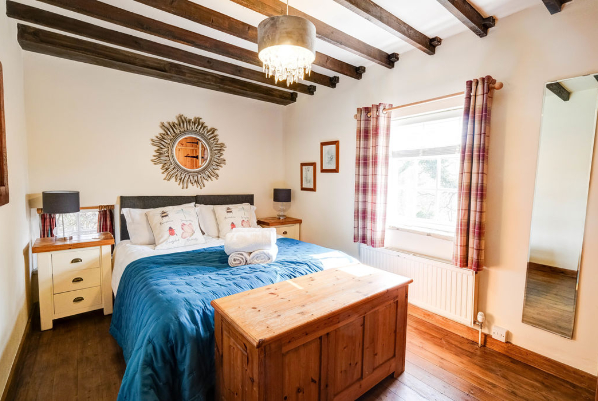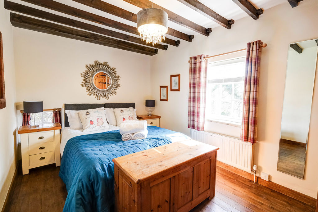 Steps lead to the cosy lounge with a picture window overlooking the patio area and rear garden. The vaulted beamed ceiling is a fabulous feature with a galleried area above and the stone floor adds to the old-world charm of the cottage. From the entrance lobby to the left there is a double bedroom with a sash window overlooking the garden and built in wardrobe cupboards.