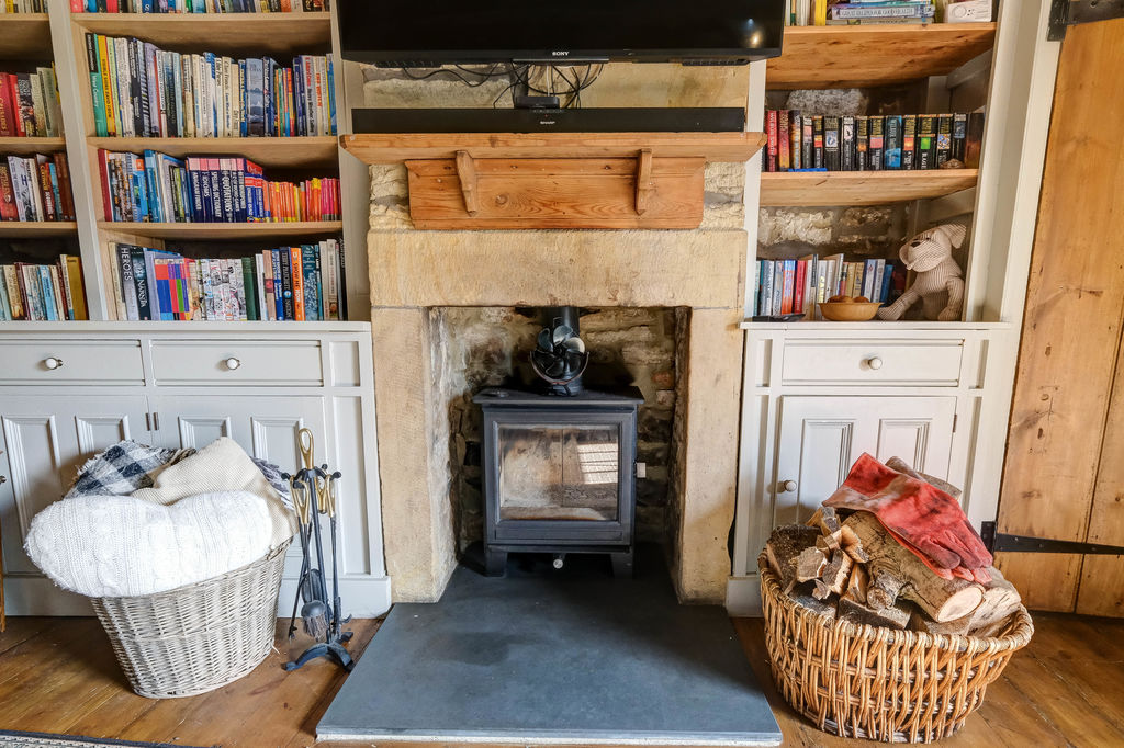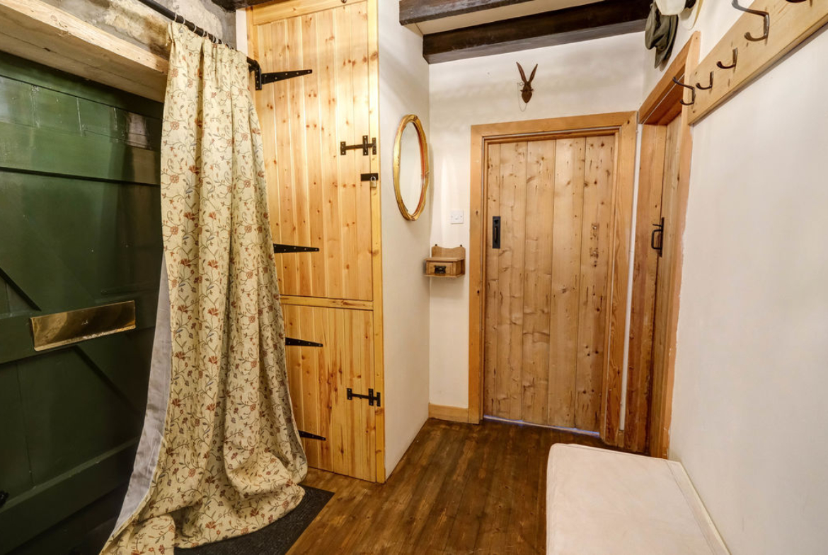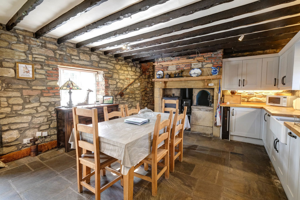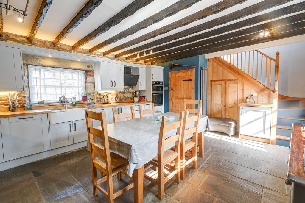 From the moment you step inside the entrance door into the lobby, the cottage sets an enchanting tone and with a latch door accessing the generous dining kitchen fitted with an ample range of base and wall units, timber worktops and a double butler sink with mixer tap. There are integrated appliances including a hob, oven and extractor, fridge freezer, washer and dishwasher. The focal point of the kitchen is the original stone fireplace with firepit and stove together with an exposed stone walls and flooring.