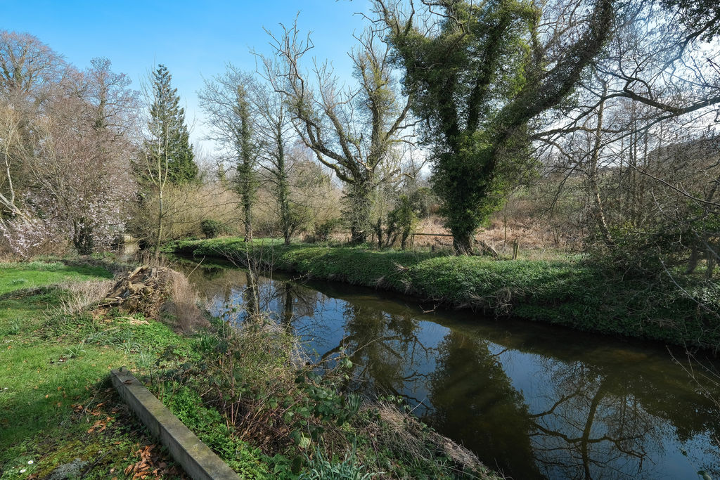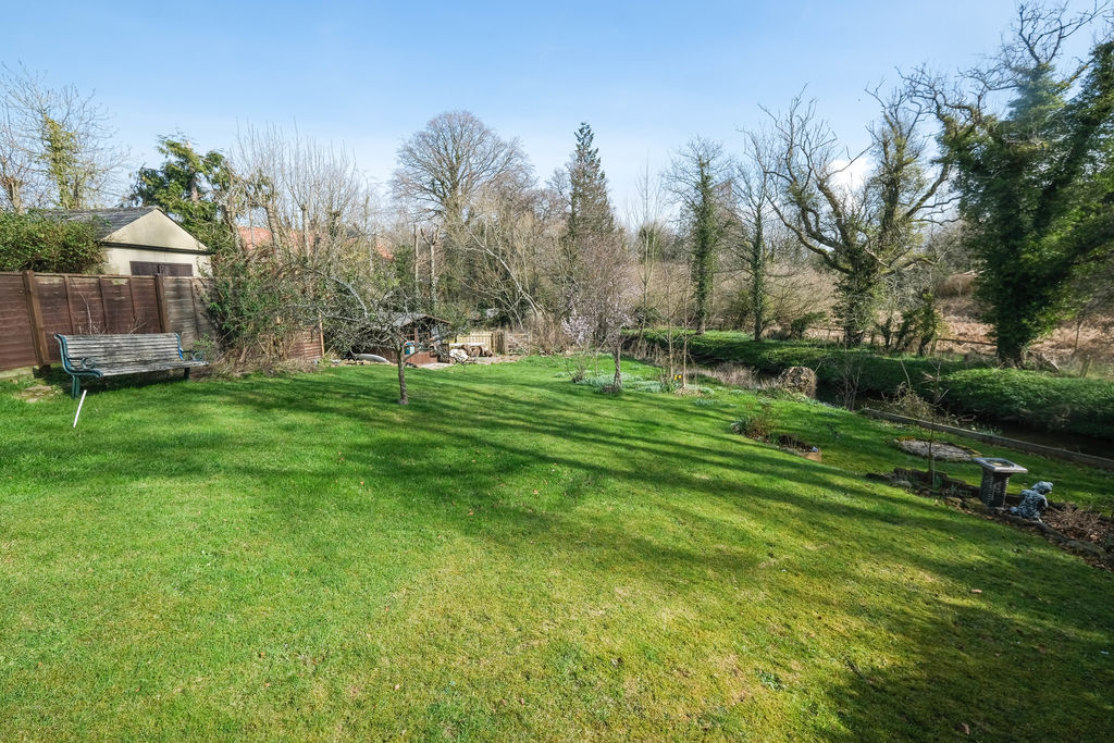 Outside the front garden is enclosed by a picket fence and a garden gate with a pathway with a lawn garden either side leads to the entrance door. The pretty cottage garden with a sunny aspect to the rear of the property is of an excellent size and wanders down to the River which meanders along the garden’s boundary.