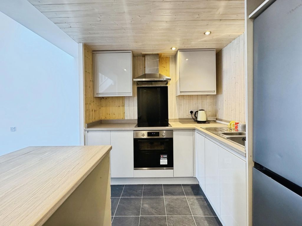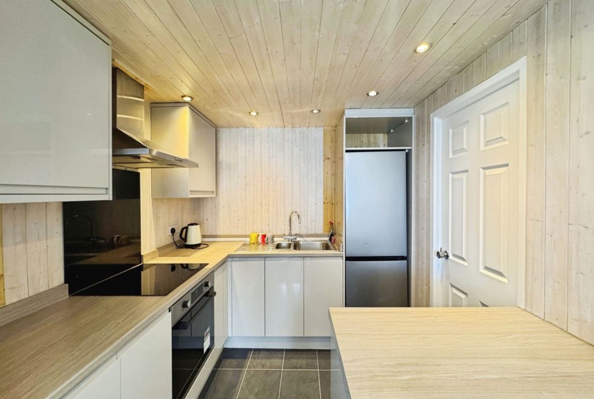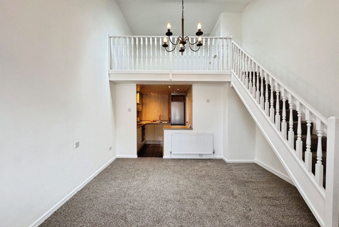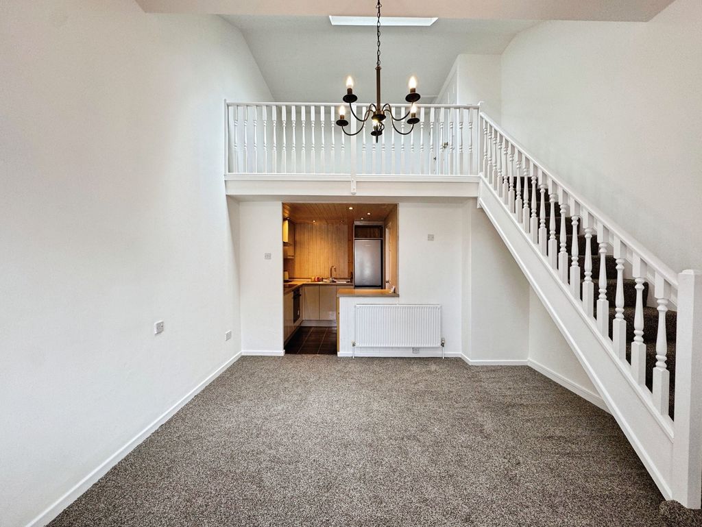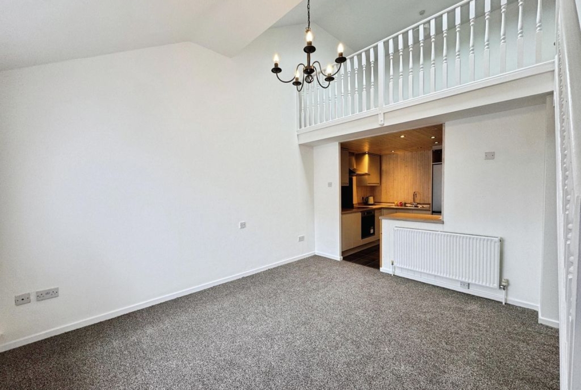 The property briefly comprises:- Entrance porch, leading straight into a light and airy open plan lounge/kitchen which offers large ceiling height a plenty of space for your own sofa and coffee table. The lounge has been fitted with light grey carpet and finished with white crisp walls. The kitchen has been fitted with a range of gloss wall and base units, offering plenty of storage. Appliances include induction hob and electric oven. The bathroom is located downstairs fitted with W.C., hand basin, bath and shower over bath.