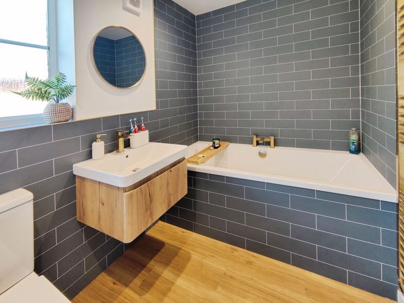 Three-piece suite in white comprising, panelled bath, wash hand basin, low-level, double-glazed window to side, double radiator, tiled flooring, extractor.
