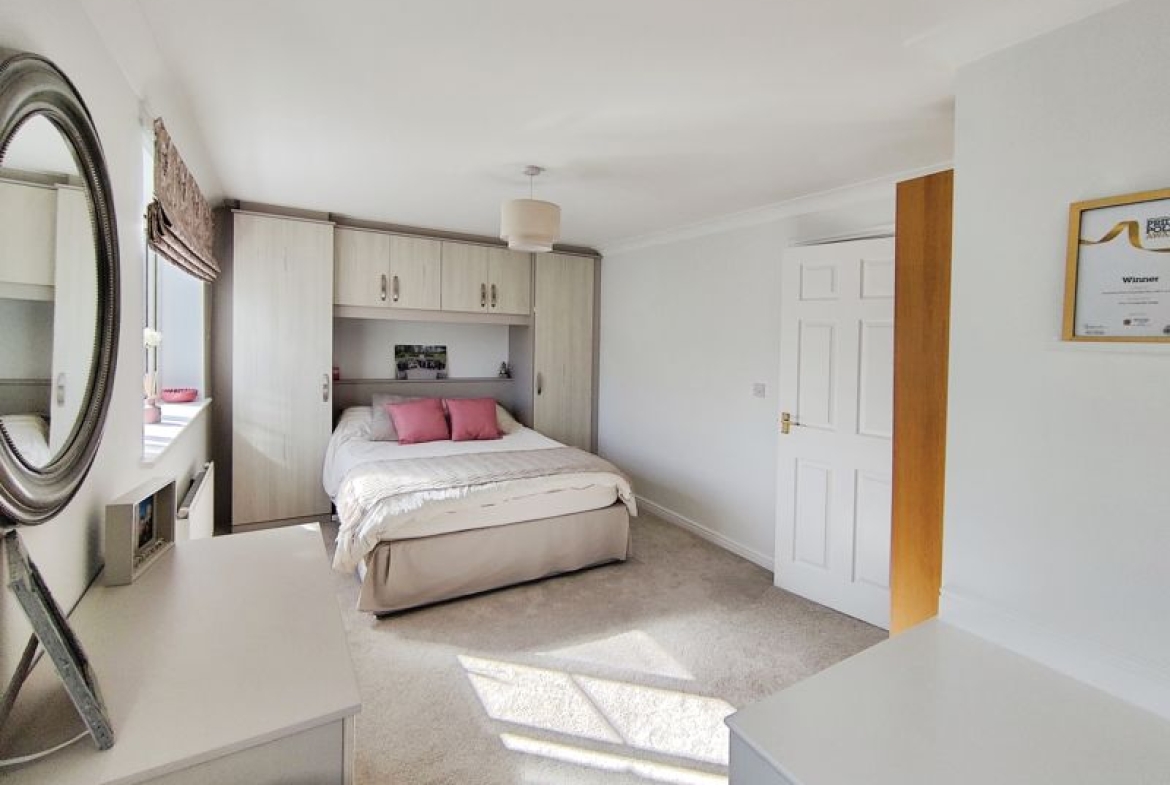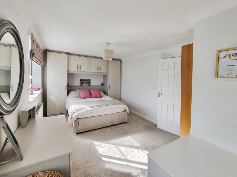 Two double glazed windows to front, single radiator, overbed fitted wardrobes, coving to ceiling.