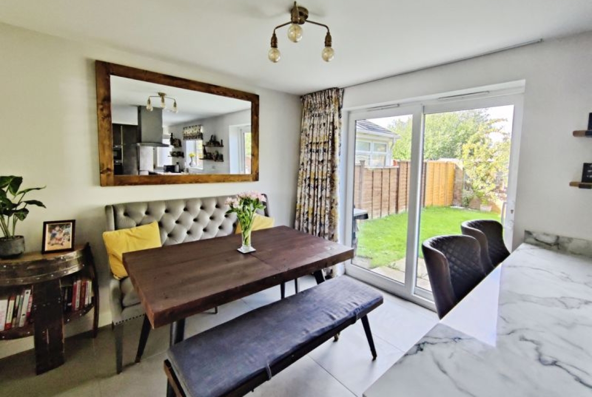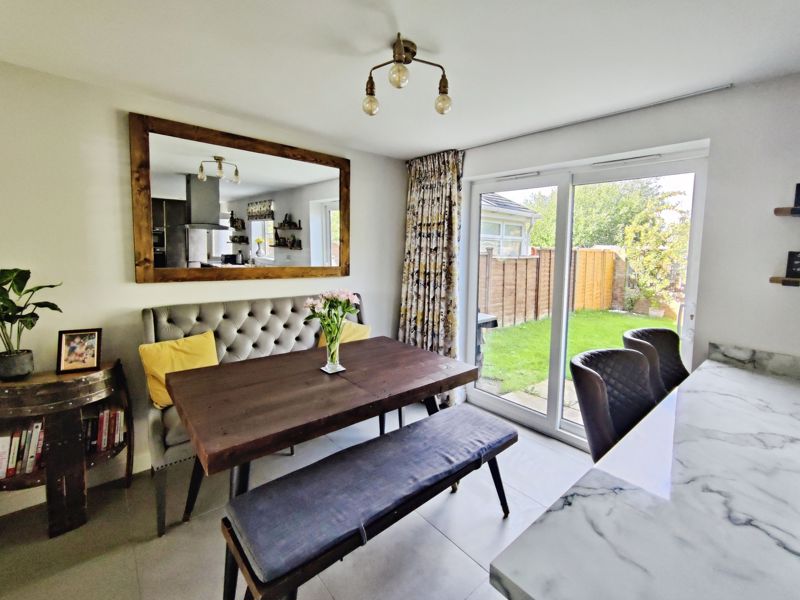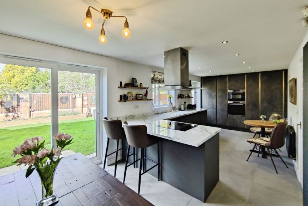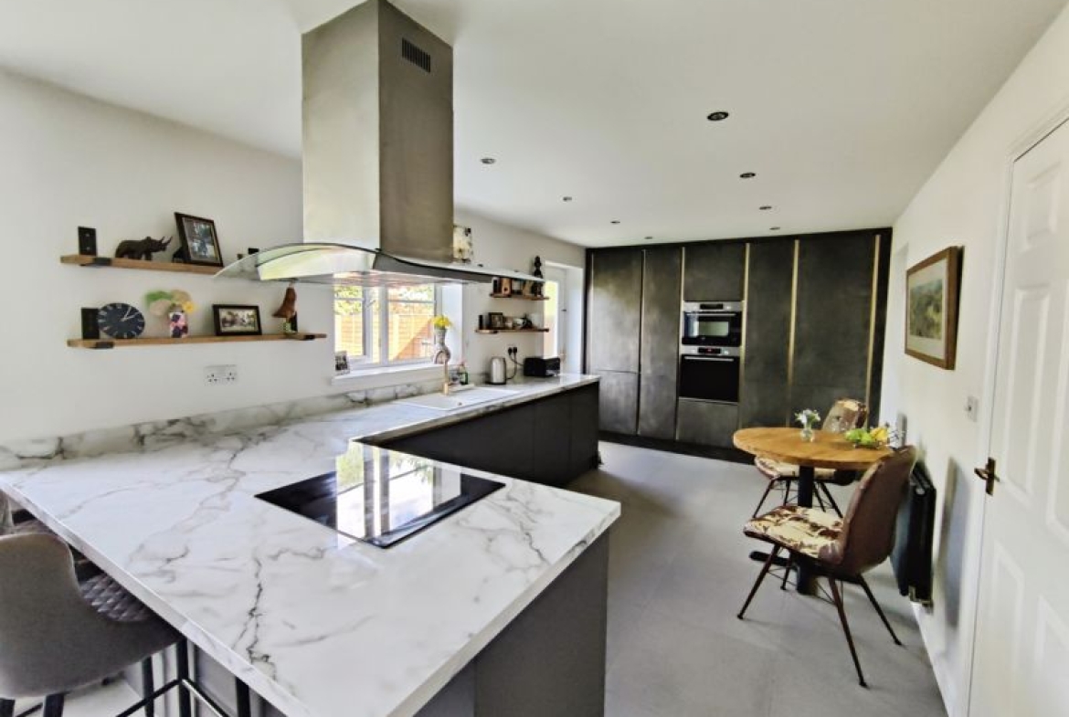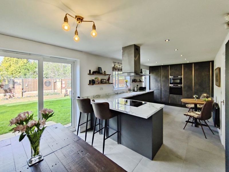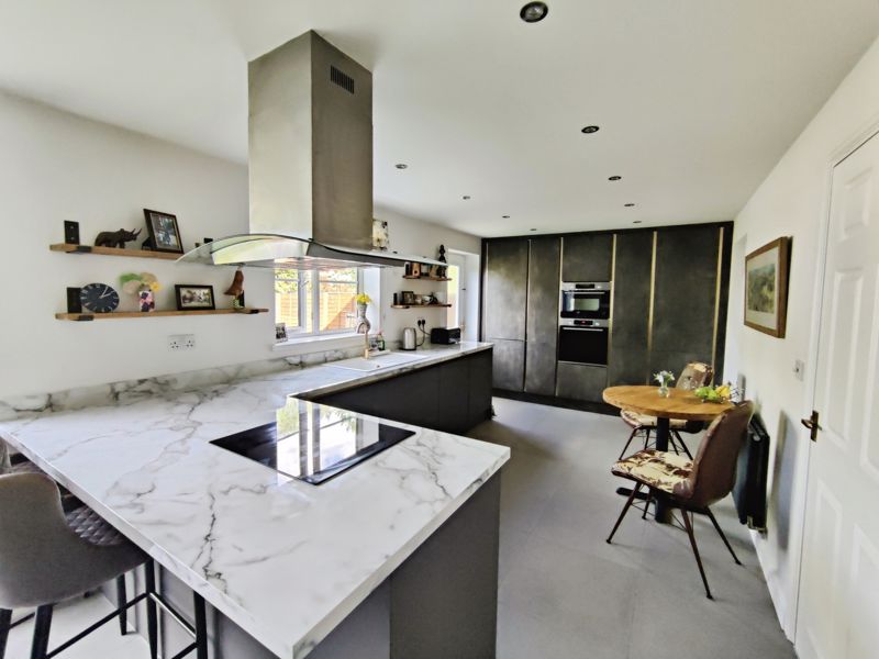 Double glazed window to front, wall mounted radiator, fitted with a range of wall, floor and drawer units with co-ordinating roll edge work surfaces, co-ordinating sink unit and drainer mixer tap, built in double oven, induction hob with extractor fan above, integrated fridge, freezer, dishwasher and microwave, spotlights, double glazed door to rear, double glazed patio doors.