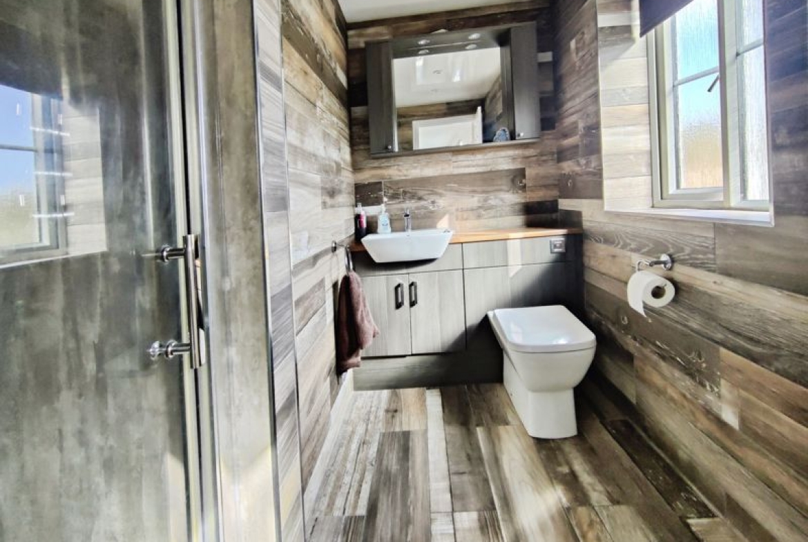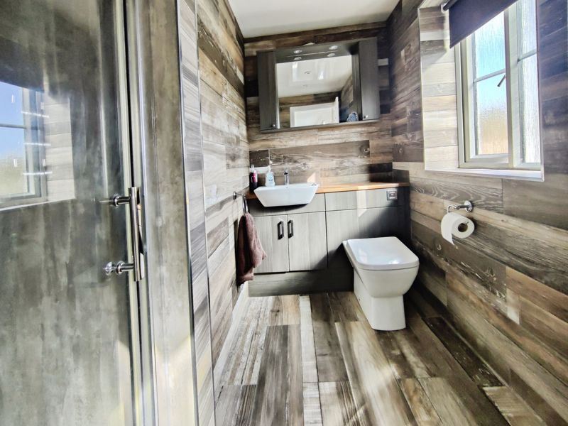 Double glazed window to front, low level wc, wash hand basin (set in vanity unit), cladding to ceiling, extractor fan, shower cubicle with mains shower, tiling to walls, heated towel rail, spotlights, tiling to floor, wall mounted vanity mirror and storage.