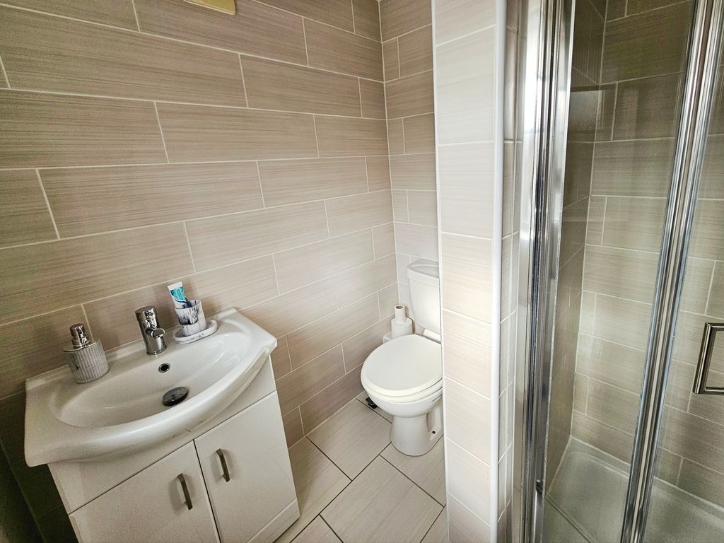 Double glazed window to front, low level wc, wash hand basin (set in vanity unit), double radiator, extractor fan, shower cubicle (mains shower), tiled walls and flooring, spotlights.
