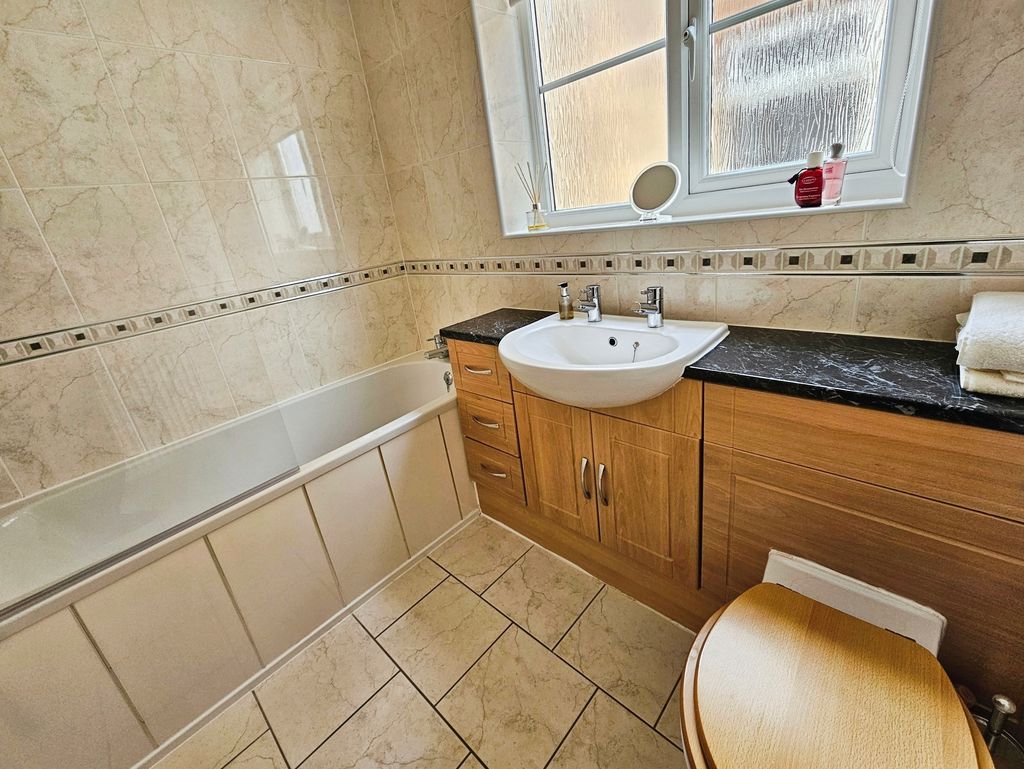 Three piece white suite comprising of; panelled bath with electric shower over, wash hand basin (set in vanity unit), low level wc, double glazed window to side double radiator, tiling to walls and flooring, extractor fan.
