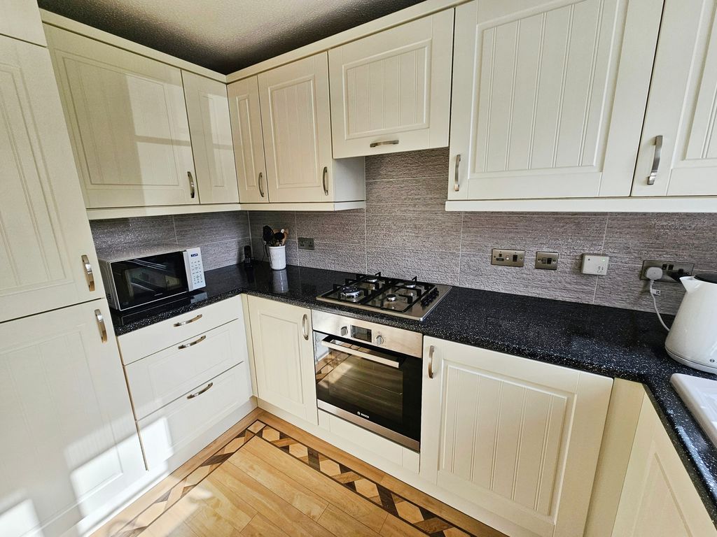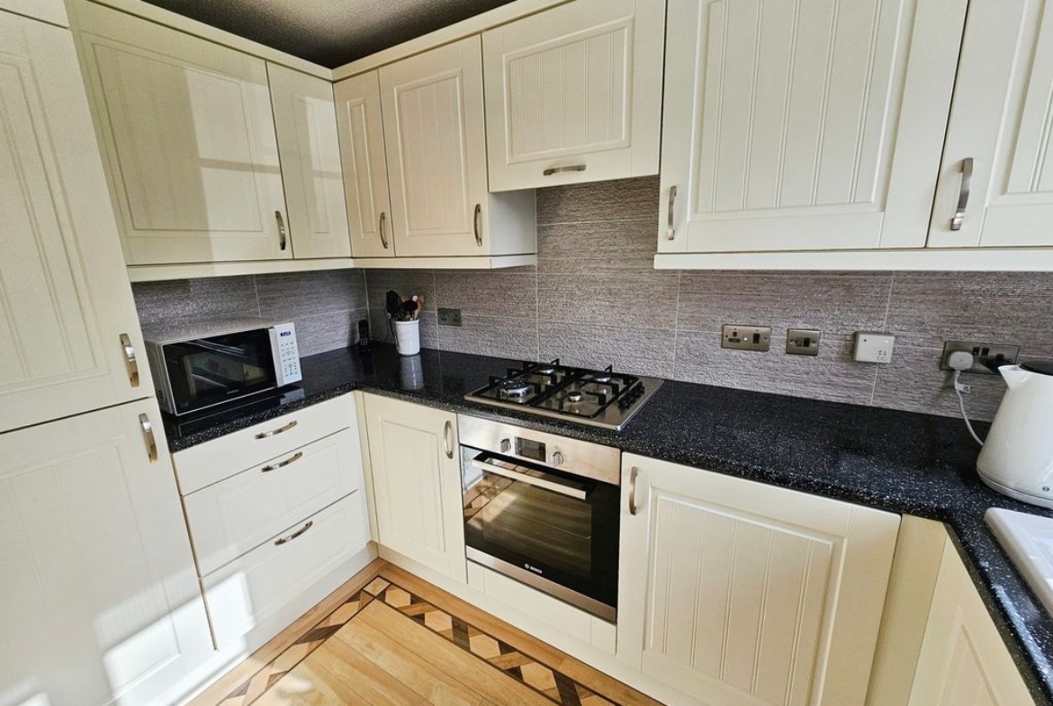 Double glazed window to front, double radiator, fitted with a range of wall, floor and drawer units with co-ordinating roll edge work surfaces, co-ordinating sink unit and drainer with mixer tap, tiled splash backs, built in electric fan assisted oven, gas hob with extractor fan above, integrated fridge freezer, washing machine and dishwasher, laminate flooring.