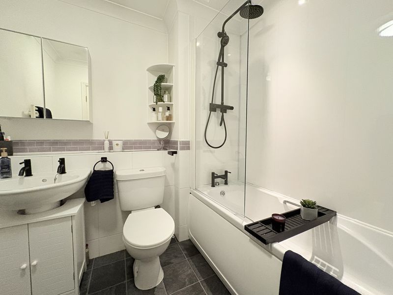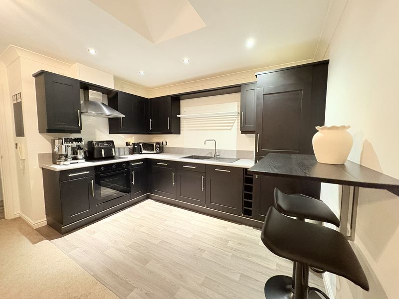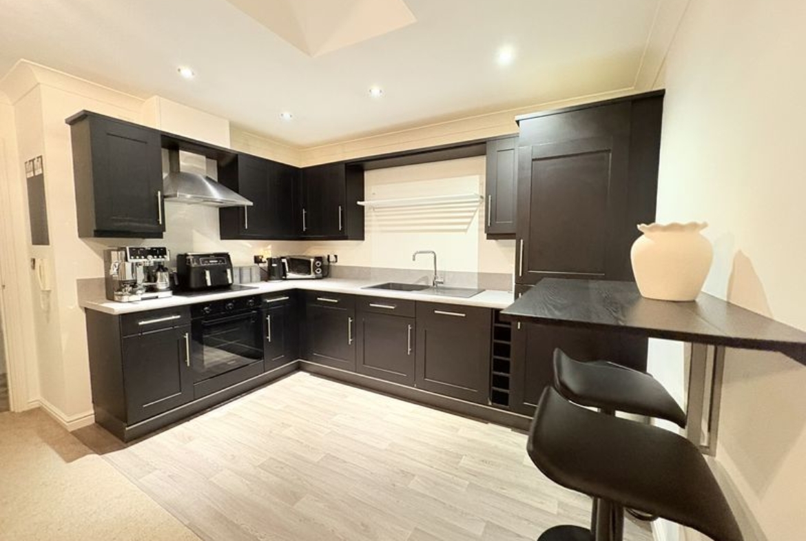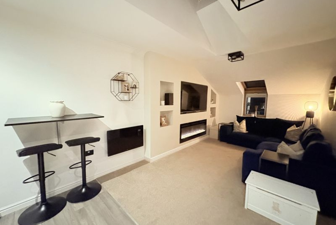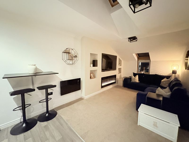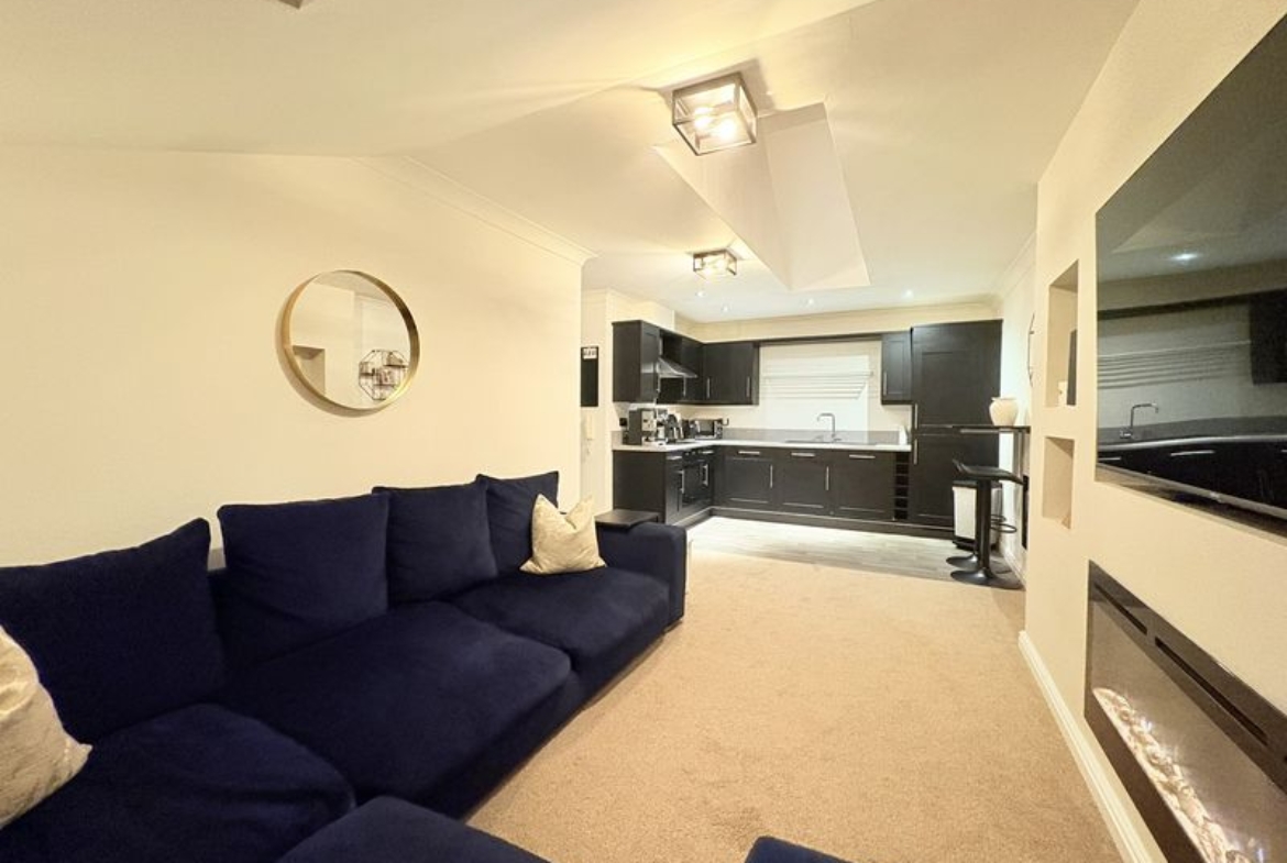 Ideally positioned within easy reach of local shops, cafés and excellent transport links including the Metro, this beautifully presented top floor two bedroom apartment offers thoughtfully designed living space, finished to an excellent standard throughout. The location provides the perfect balance of convenience and lifestyle, with everyday amenities just moments away. The heart of the apartment is the impressive open-plan kitchen/lounge/diner, a superb space designed with modern living in mind. The lounge area is centred around a sleek built-in media wall incorporating a contemporary electric fire and recessed display shelving, creating a stylish focal point and a cosy setting for relaxing evenings. The layout flows seamlessly into the dining area and kitchen, making it equally suited to entertaining guests or enjoying quiet nights at home. The kitchen features striking dark cabinetry complemented by modern work surfaces and integrated appliances, along with a breakfast bar seating area for informal dining. Well-considered lighting and ceiling detailing elevate the overall feel, while the décor throughout enhances the sense of space and light. The principal bedroom is well-proportioned and tastefully finished, offering a calm and comfortable retreat with ample room for furnishings. The second bedroom is versatile and adaptable, ideal as a guest bedroom, nursery or home office depending on requirements. The bathroom is fitted with a contemporary suite comprising bath with shower over, wash basin and WC, presented in a clean, modern style. Externally, the property benefits from resident parking with an allocated parking space. Offering stylish, ready-to-move-into accommodation in a highly convenient location, this apartment will appeal to a wide range of buyers.