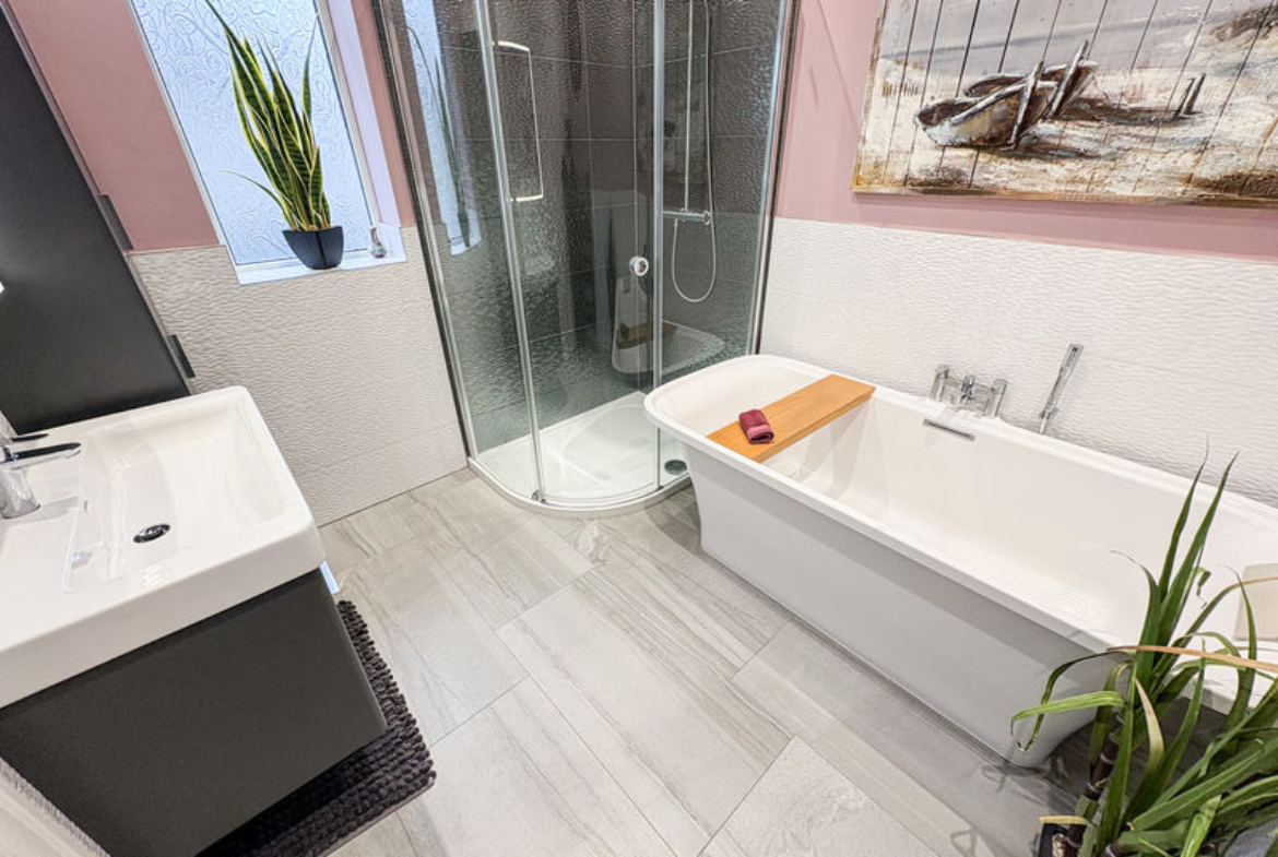 To the first floor, there are three well-proportioned bedrooms, all finished to a high standard and continuing the home’s sense of comfort and quality. The bathroom is particularly charming, featuring a freestanding bath alongside a separate shower cubicle, creating a luxurious and relaxing retreat.