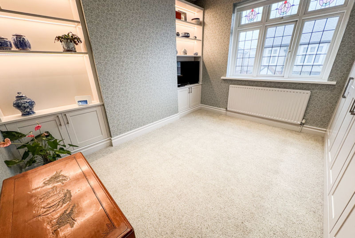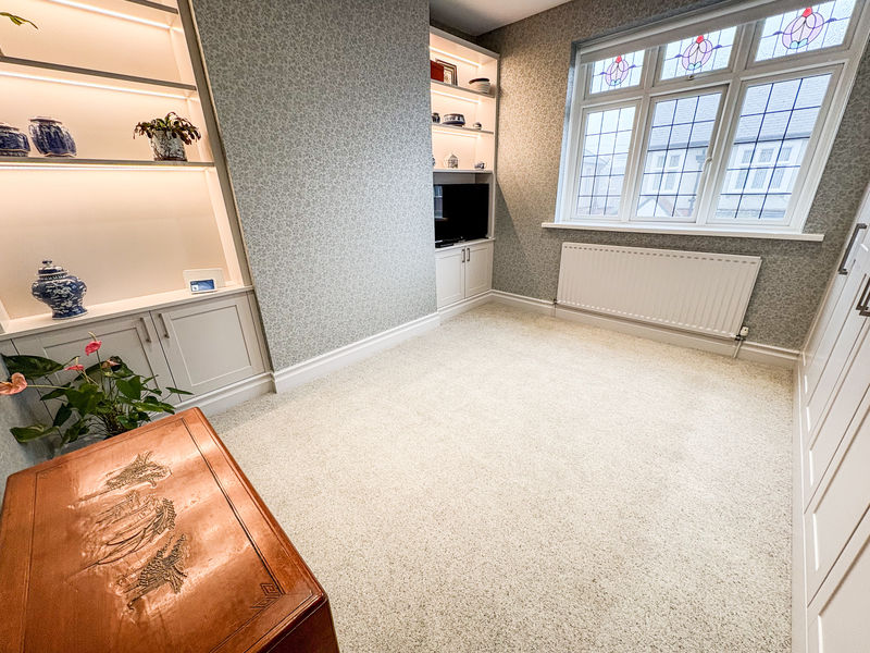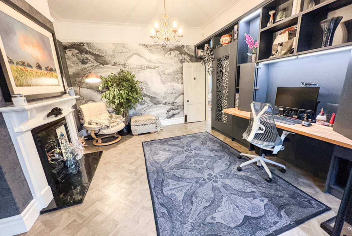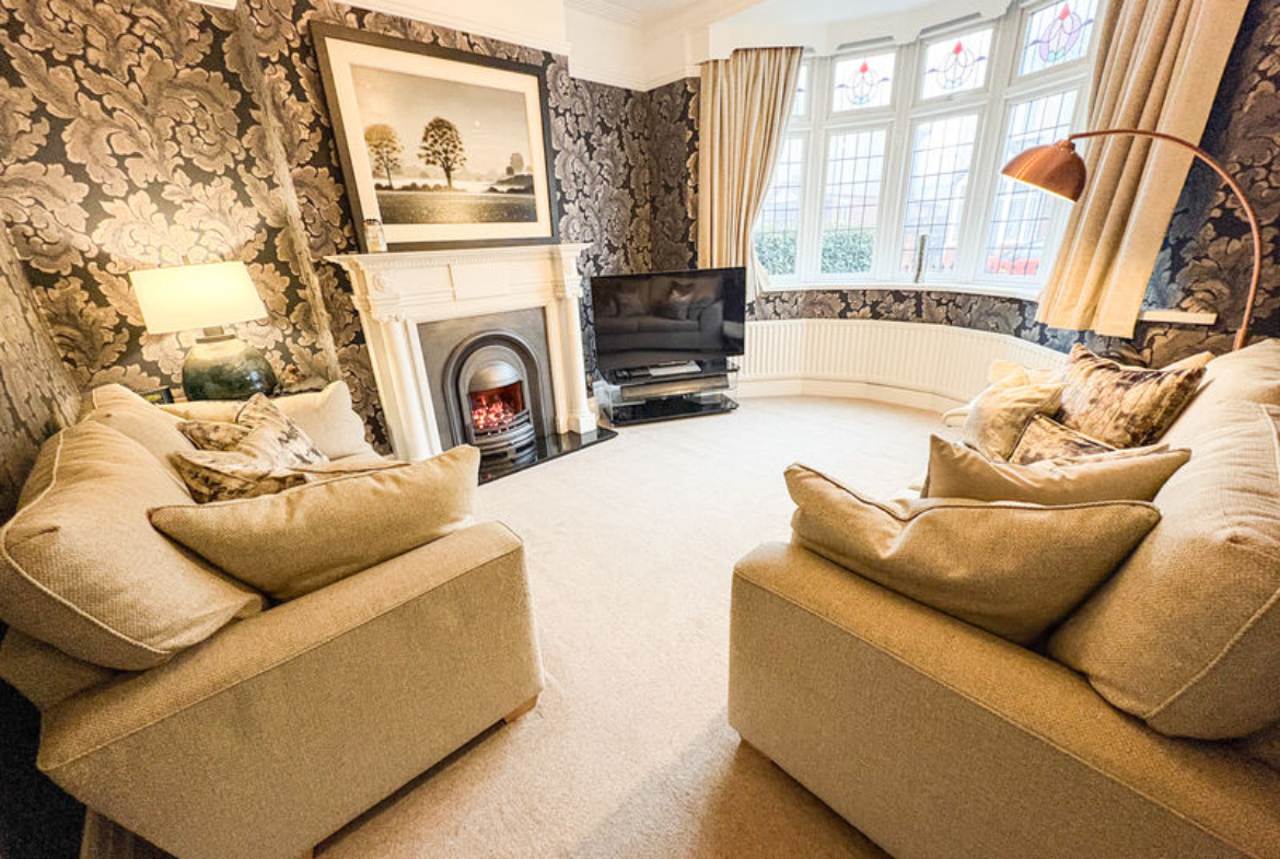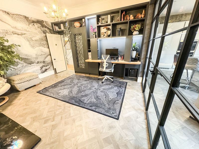 The front lounge is a beautifully appointed space, featuring a striking fireplace with a gas fire as its focal point and a classic bay window that fills the room with natural light, creating a warm and inviting atmosphere. Original features flow throughout the property, adding character and charm that perfectly balance the contemporary enhancements.