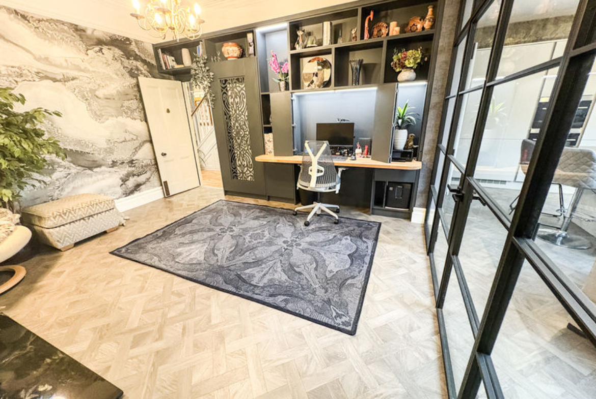 The dining room is equally impressive, offering flexibility for modern lifestyles with a cleverly designed fold-out office space. Gorgeous acoustic industrial-style doors provide a bold yet elegant design feature, allowing the room to adapt effortlessly between work, dining and entertaining.