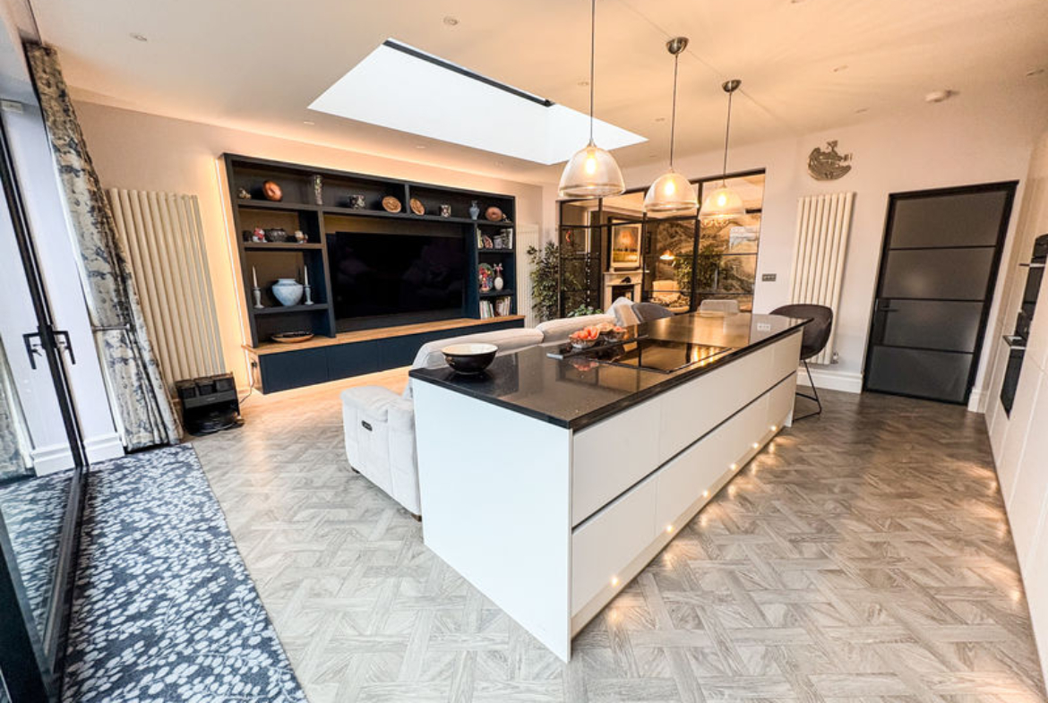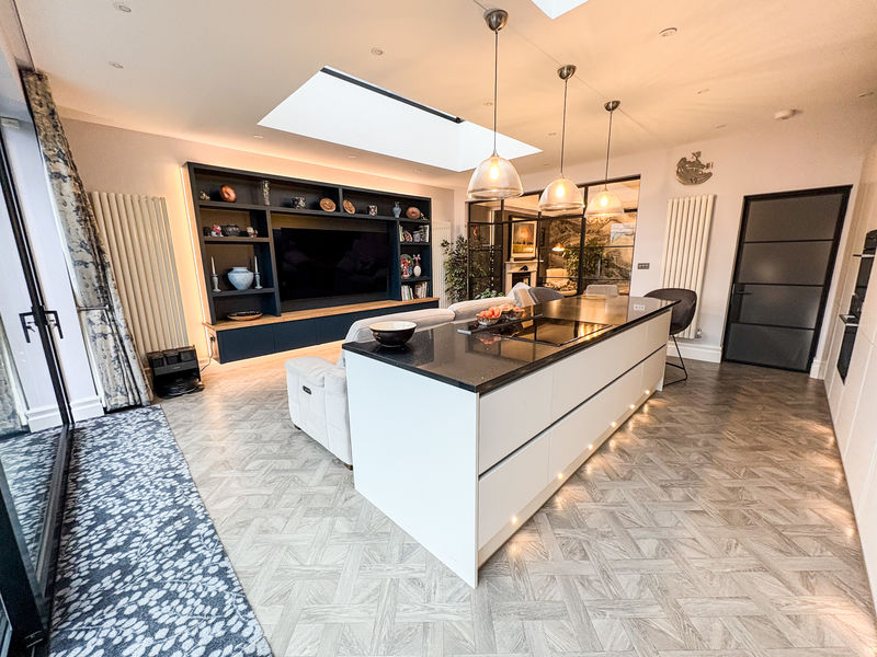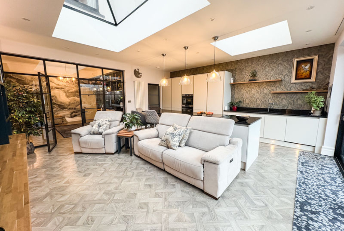 To the rear, the home opens into a stunning large kitchen extension designed to an exceptional show-home standard. Flooded with light from ceiling window lanterns, this impressive space forms the heart of the home, offering integrated appliances, a statement centre island and a generous family living area ideal for both everyday living and entertaining. A separate utility room and a stylish downstairs W.C further enhance the functionality of the ground floor.