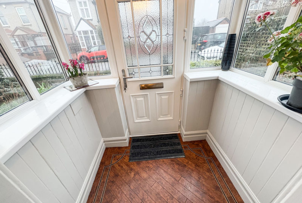 ENTRANCE: UPVC entrance door opening into a double glazed porch, with an internal door leading into the hallway featuring the original leaded glazing.