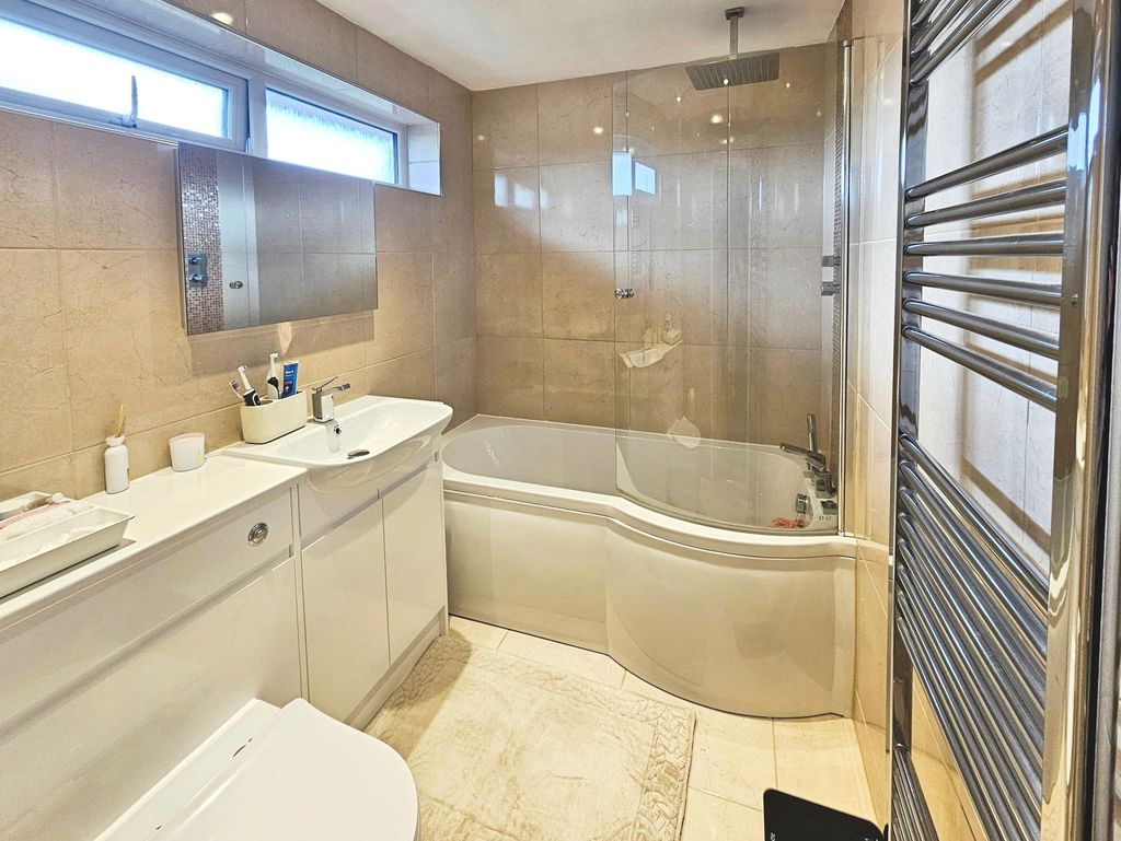 Three piece white suite comprising of; paneled bath with mains shower over, wash hand basin (set in vanity unit), low level wc, spotlights, double glazed window to side, heated towel rail, tiled walls and flooring, extractor fan.