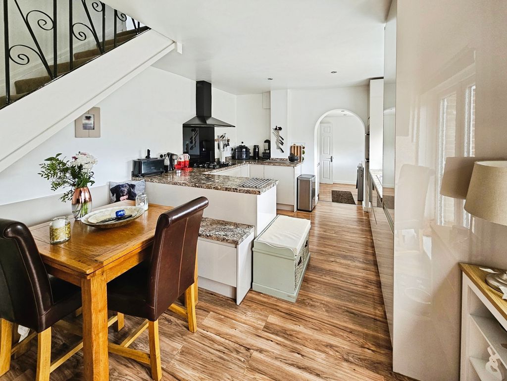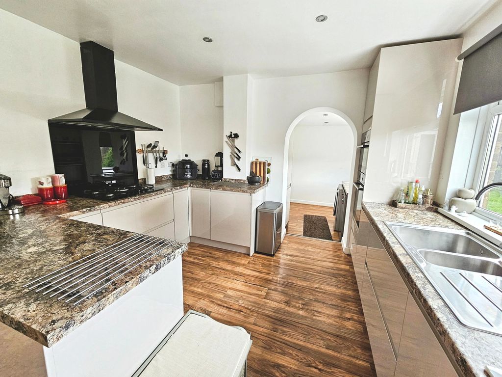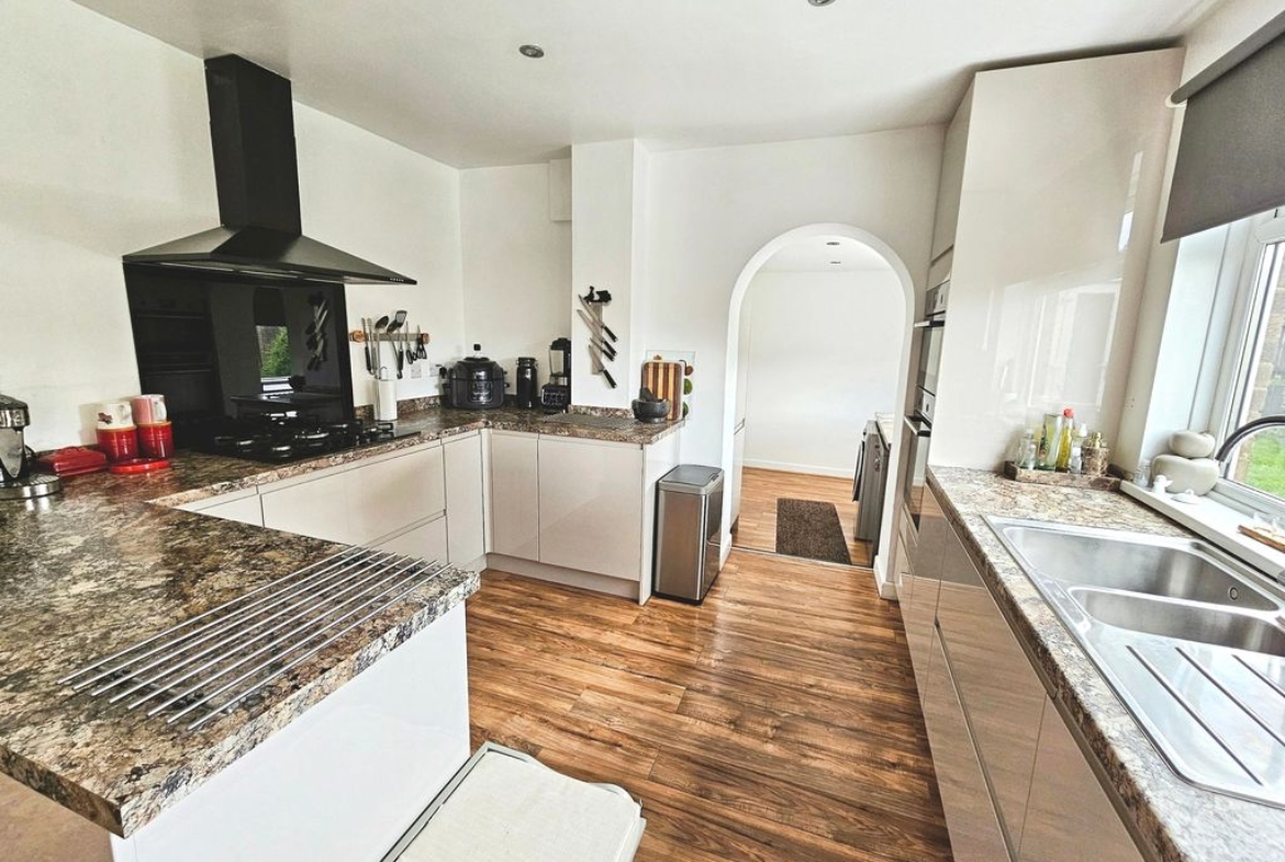 Double glazed windows to rear, fitted with a range of wall, floor and drawer units with co-ordinating roll edge work surfaces, stainless steel sink unit and drainer with mixer tap, upstands, built in electric fan assisted oven, 5 ring has hob with extractor fan above, integrated fridge, laminate flooring, double glazed patio doors to rear.