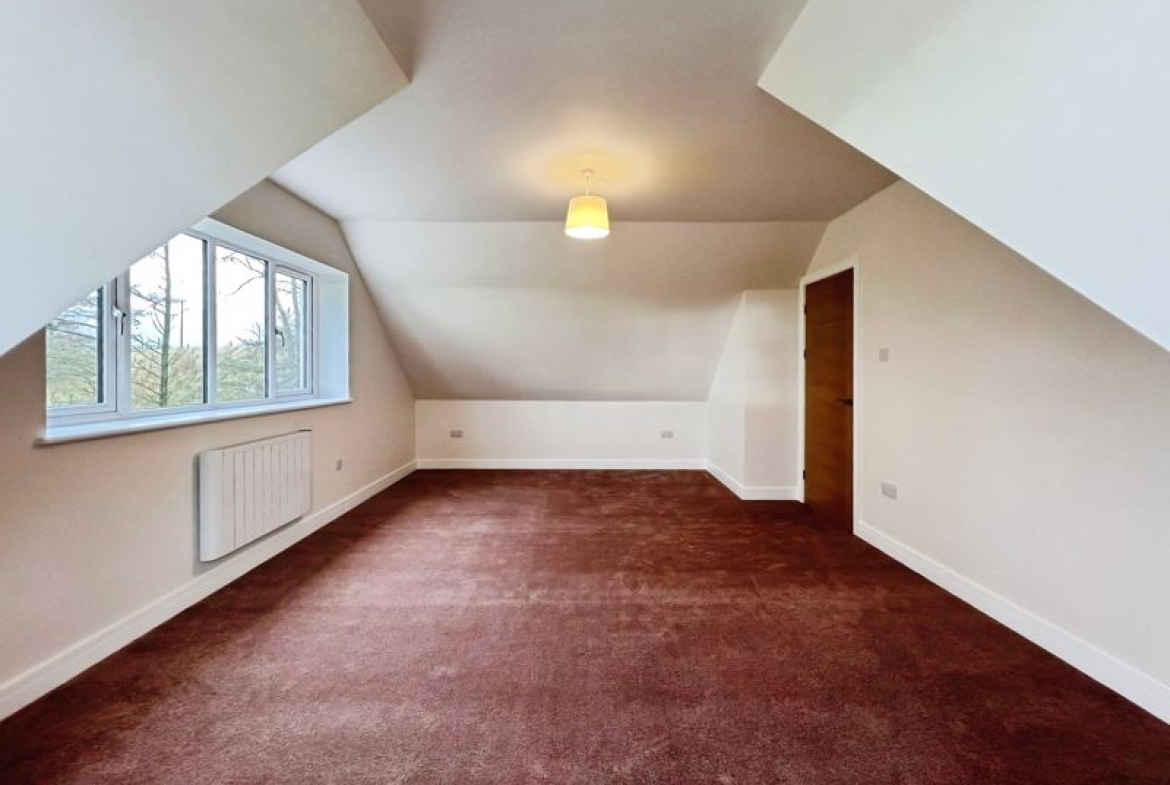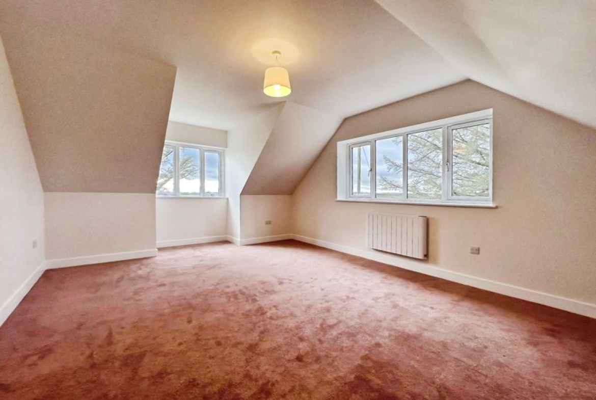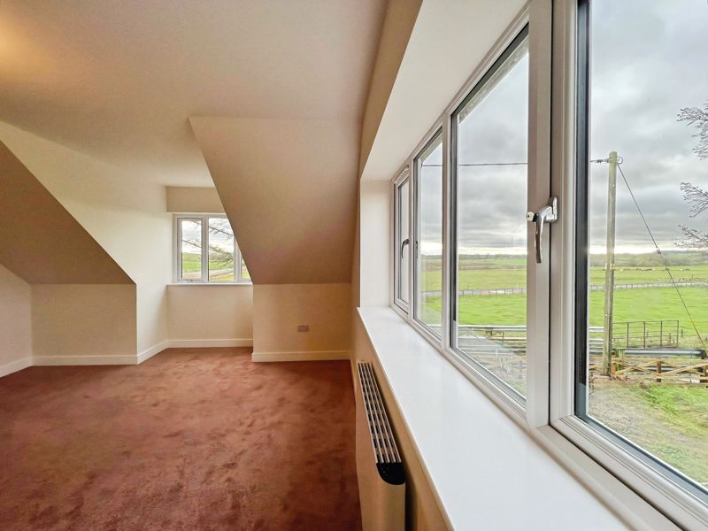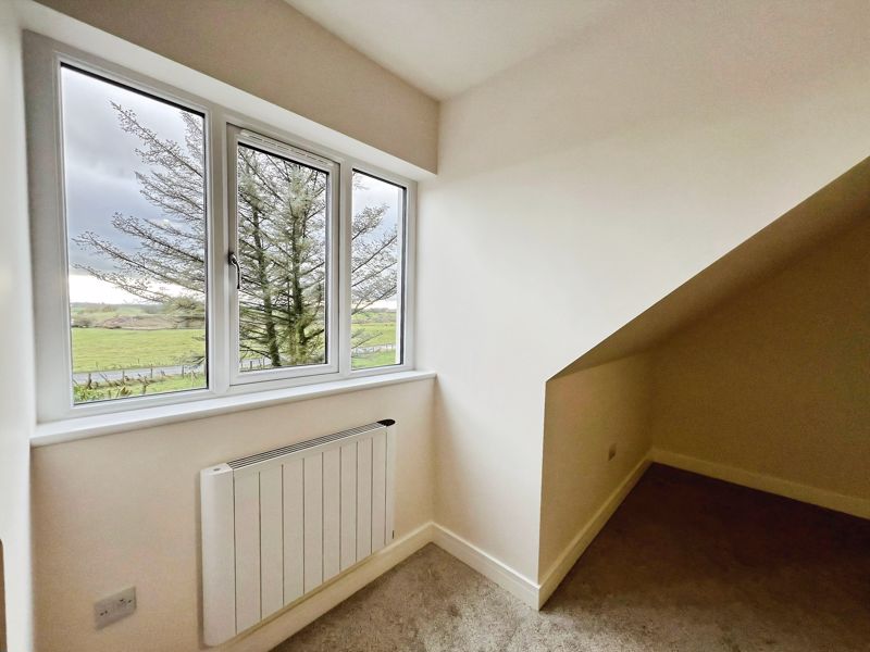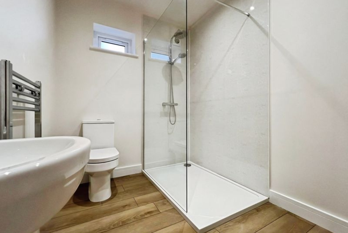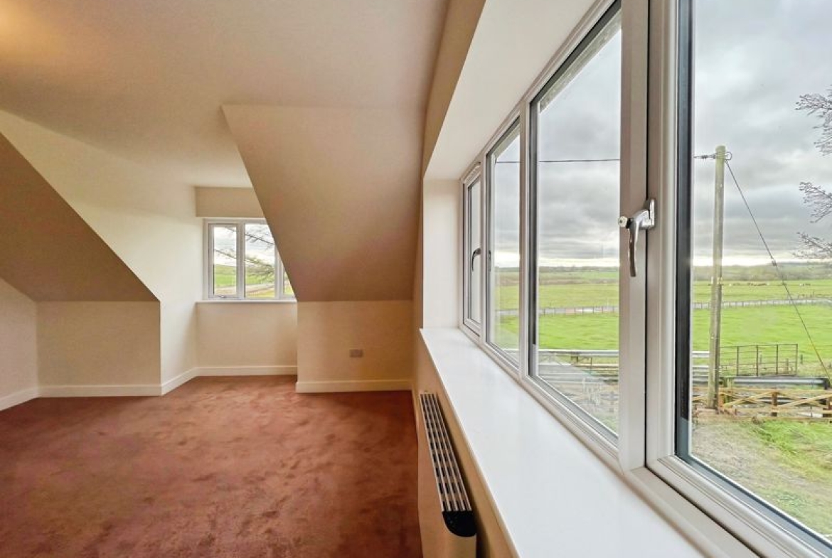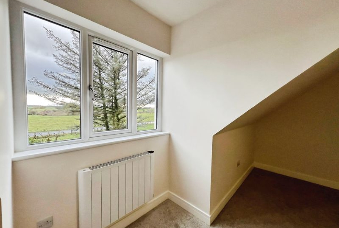 Accommodation includes three bedrooms: a spacious double master that benefits from dual aspect windows and open views, a second double bedroom, and a comfortable single. The family bathroom is finished with a heated towel rail and a quality bath, while the ground floor includes a shower room equipped with a rain shower and heated towel rail.