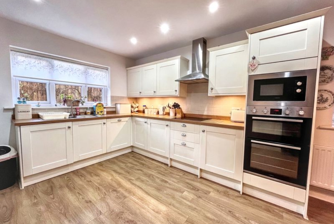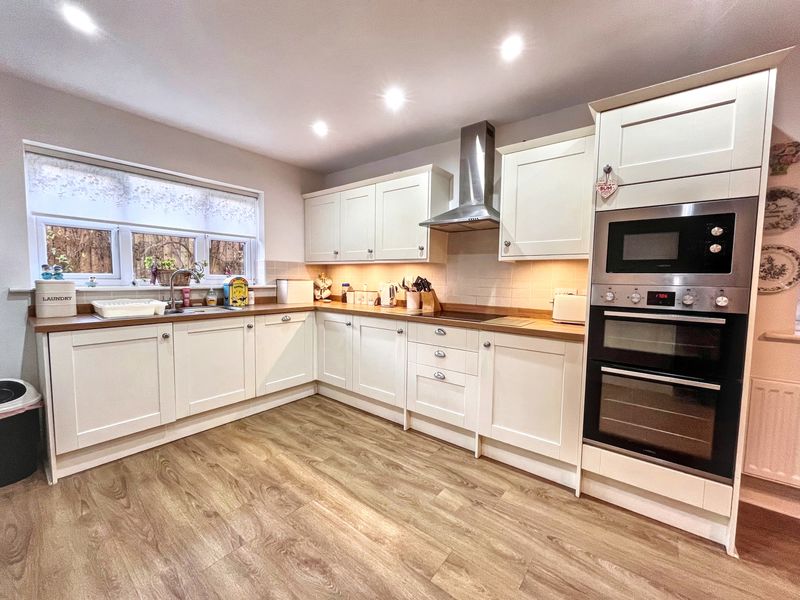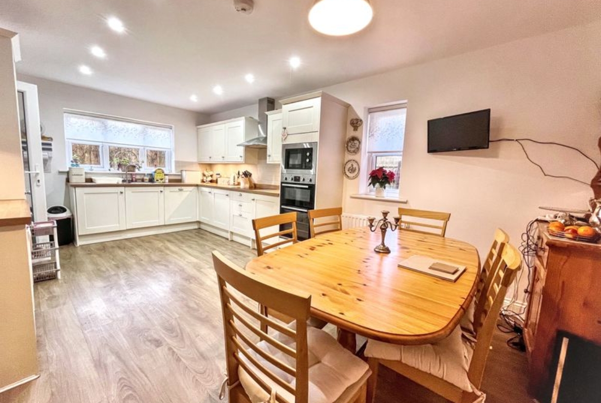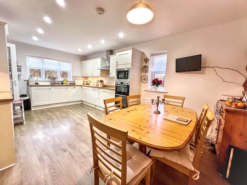 In addition to the separate living room at the front of the property, the extension at the rear has created a substantial sun room overlooking the attractive gardens, which extend to the rear and sides of the property. The open-plan kitchen, complete with integrated appliances and a dining area, offers a space suitable for everyday living and entertaining. A separate guest downstairs W.C. and a first-floor shower room add to the property’s functional layout.