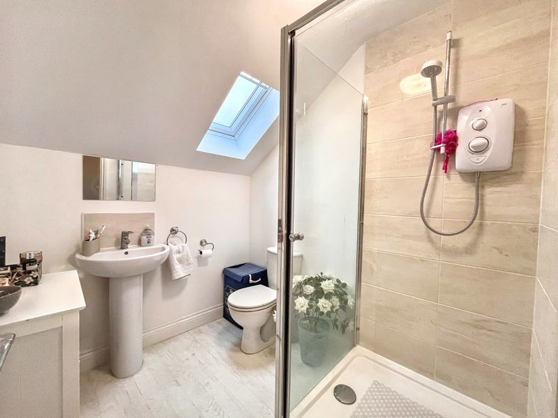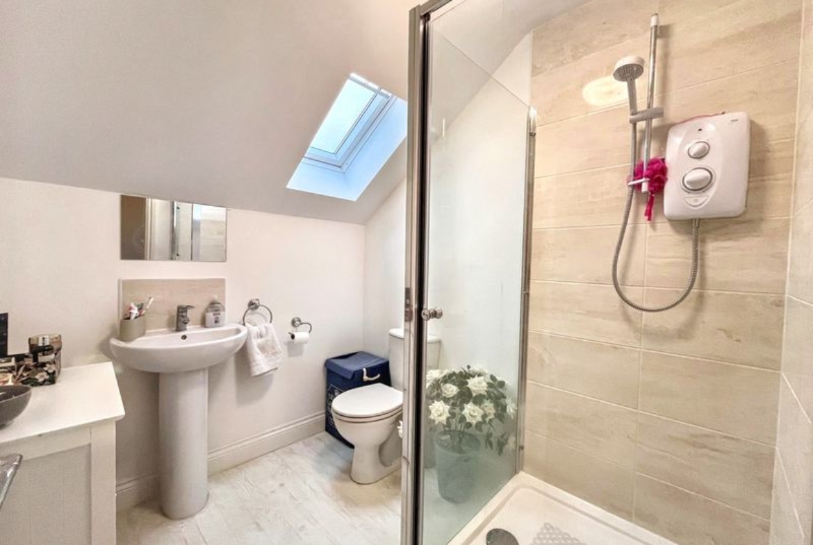 Tiled shower cubicle with electric shower | Close-coupled WC | Pedestal wash-hand basin with tiled splash-back | Radiator | Double-glazed Velux window | Extractor
