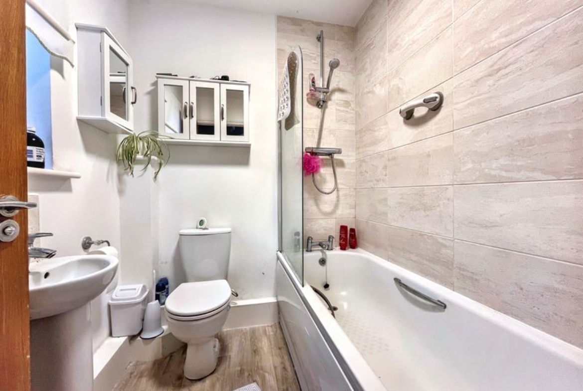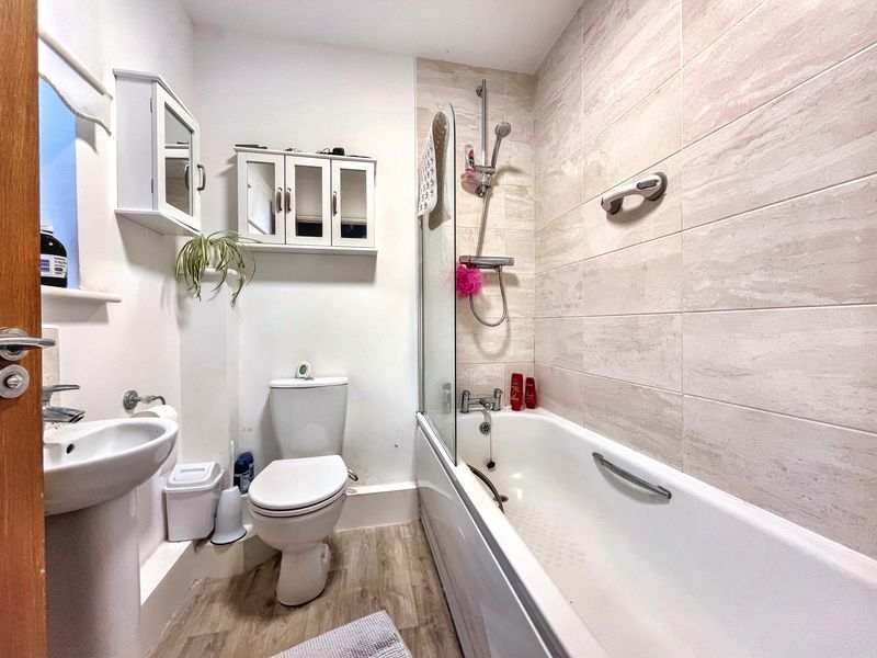 Bath with a tiled surround and mains shower with a glass screen | Close-coupled W.C | Pedestal wash-hand basin with tiled splash-back | Radiator | UPVC double-glazed frosted window | Extractor