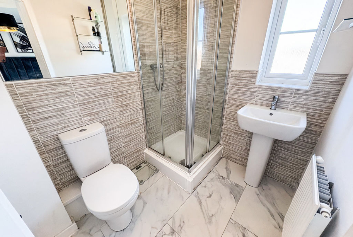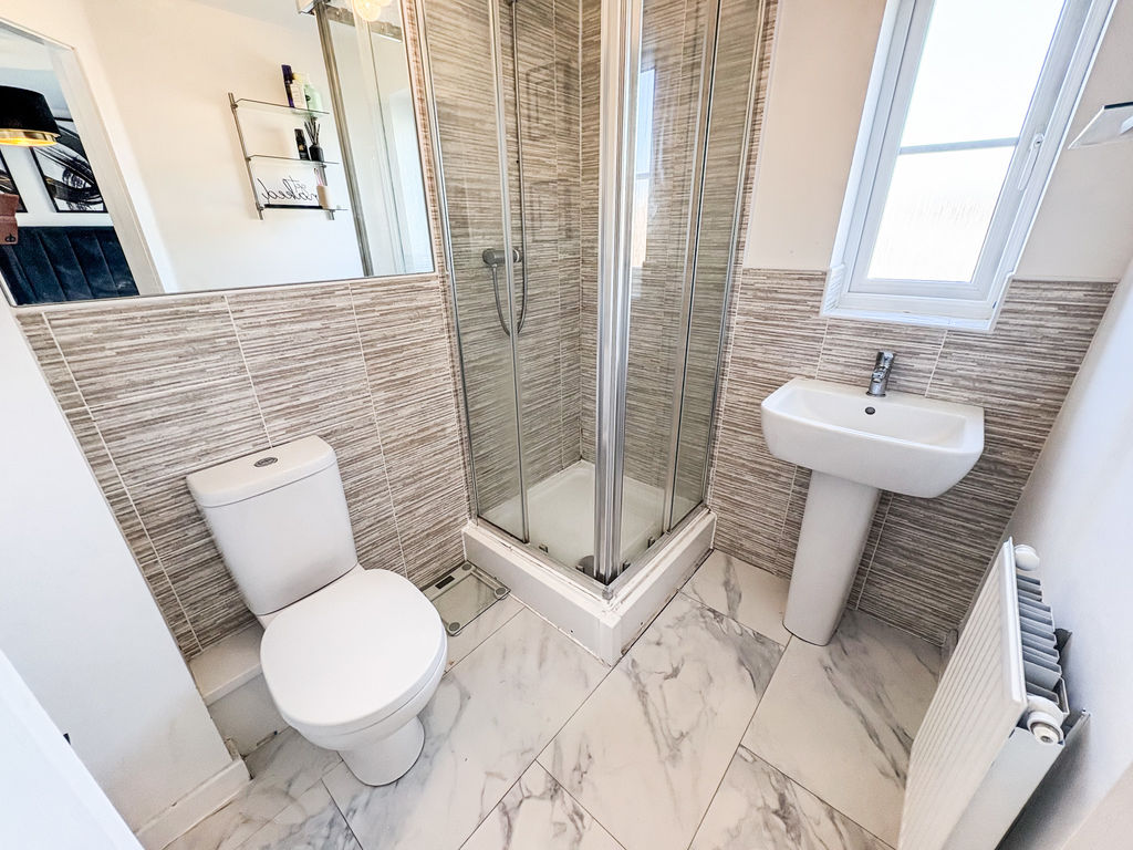 EN-SUITE SHOWER ROOM: double glazed window to rear, low level wc, single radiator, shower cubicle and part tiling to walls.